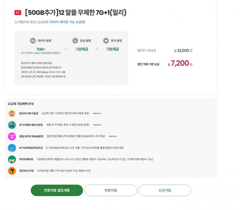 상품명KT [50GB추가]12 알뜰 무제한 7G+1(밀리) 7200원 12개월간 무료